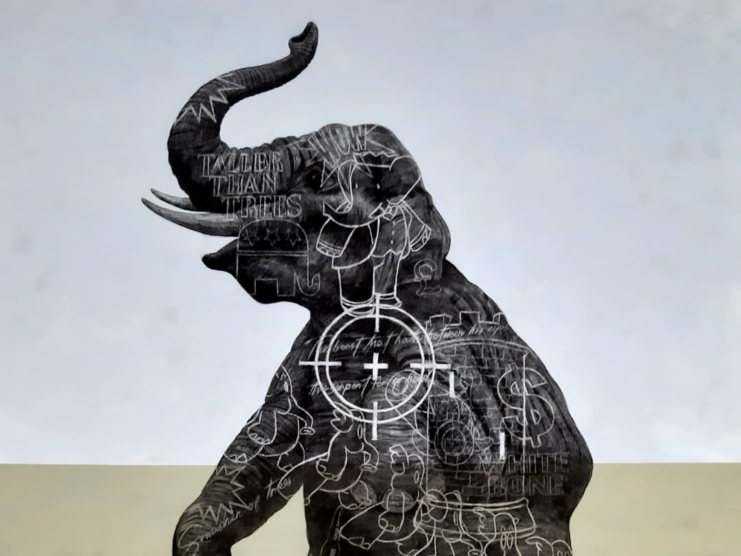 The elephant in the room (left), 2020. Charcoal and acrylic on canvas. 240 x 300 cm. ← Previous Next → The elephant in the room (left), 2020. Charcoal and acrylic on canvas. 240 x 300 cm. The elephant in the room (left), 2020. Charcoal and acrylic on canvas. 240 x 300 cm.