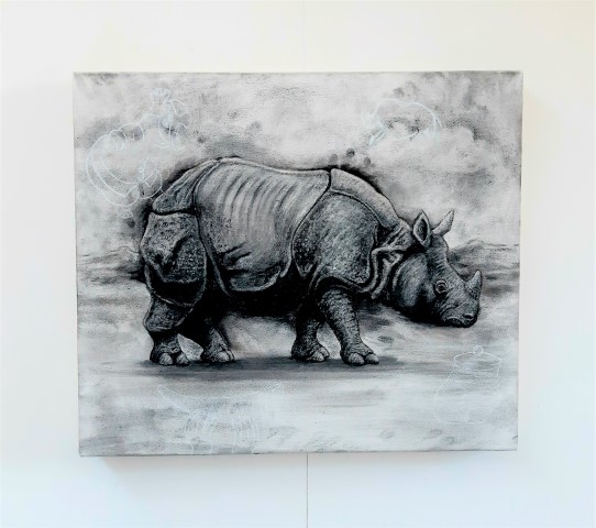 Published April 23, 2021 at 376 × 480 in The Indian Rhinoceros, 2021. Charcoal and chalk on primed canvas. 61 x 71 cm. Wall view.